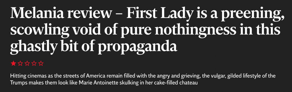 Many reviews highlighted how poorly the film resonated with critics, with The Daily Beast reporting that Melania had landed a critics score far below expectations and drawing comparisons to notoriously disliked films such as Cats. The article noted critics labeled the film “insipid,” “pointless,” and like a “shameless infomercial.”